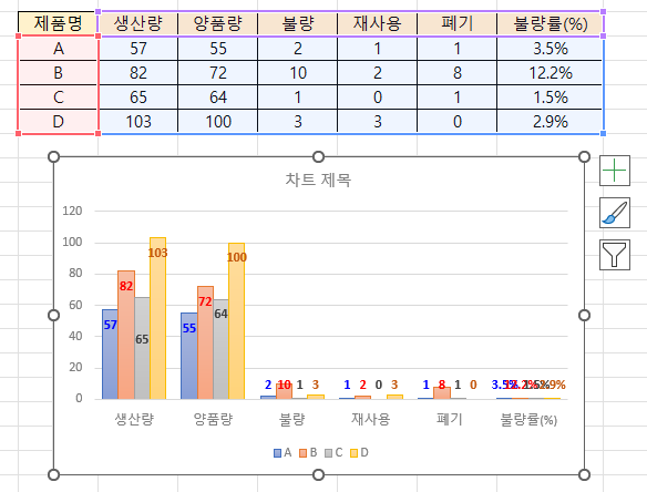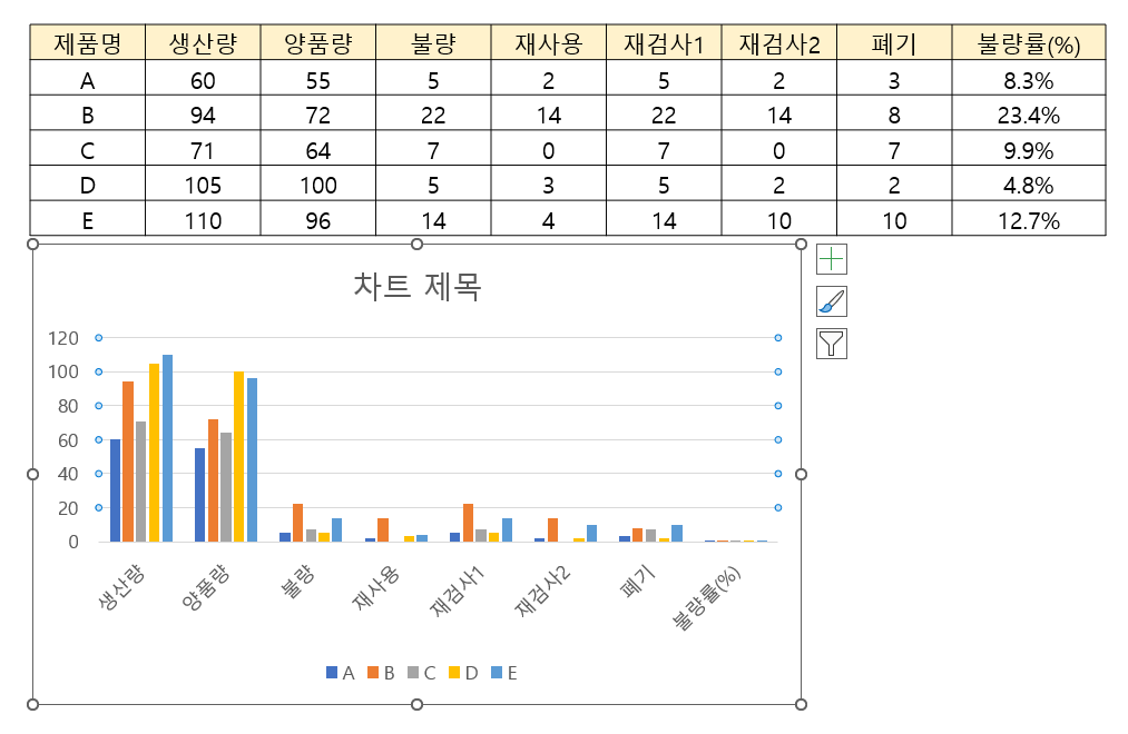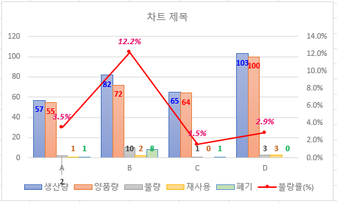 위 예시에선 차트에 적용되는 계열 숫자가 동일한 데이터를 사용하여 작성하였습니다.