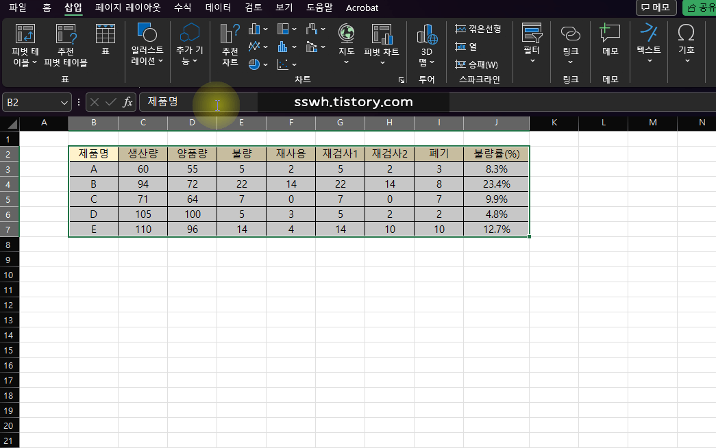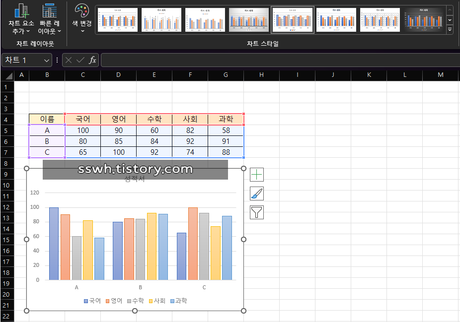 예시로 5번째 스타일을 적용한 성적서 차트를 만들었습니다.