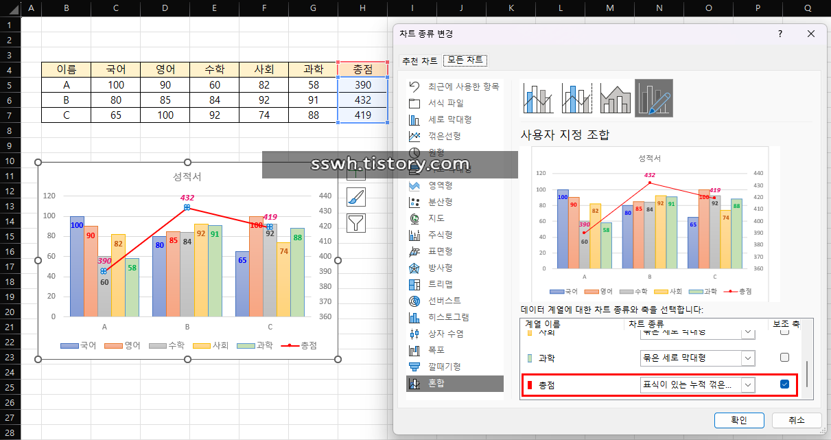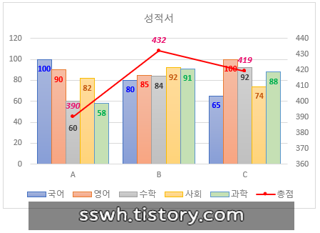 이렇게 과목별 점수는 막대그래프로, 총점은 꺾은선으로 표시되는 저만의 차트가 만들어졌습니다.