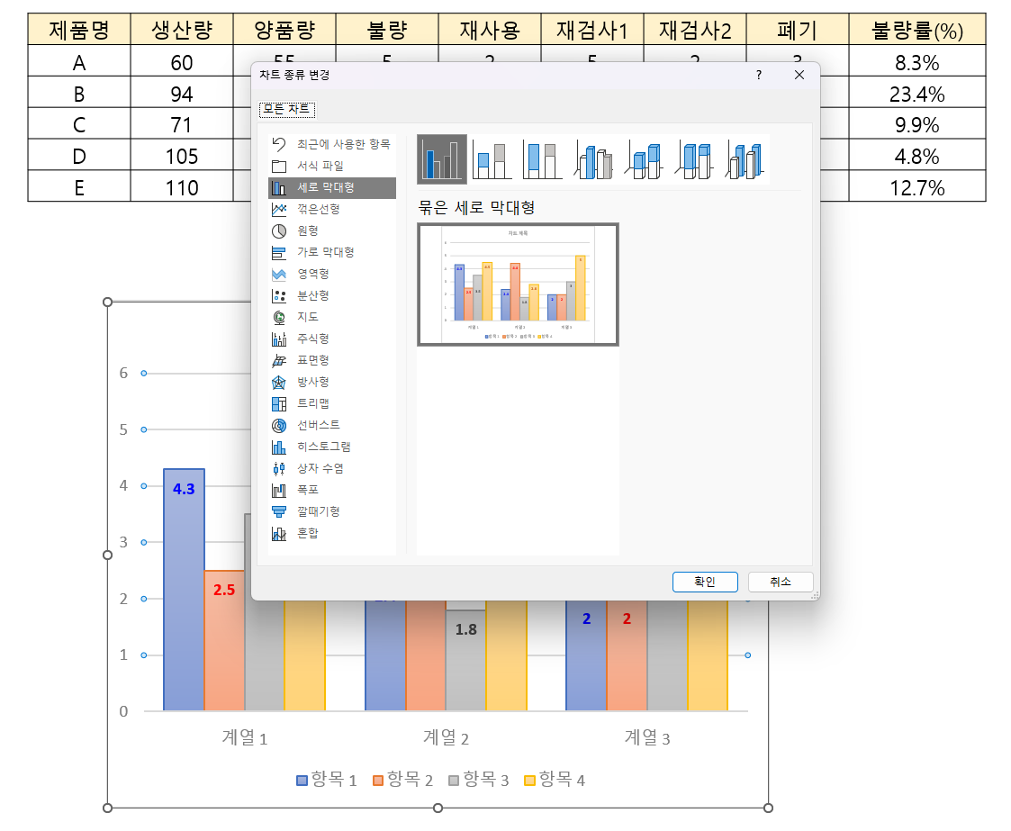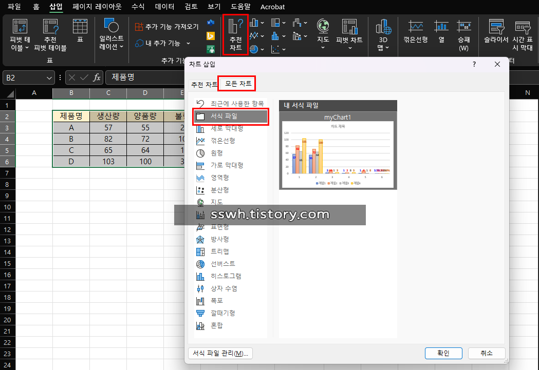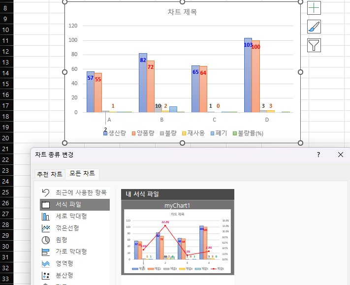 이제 다시 차트 선택 후 차트 종류 변경을 통해 서식 파일로 접근합니다.