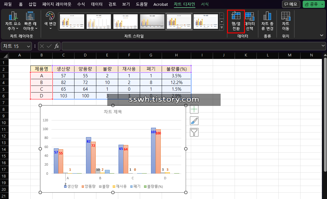 여기서 다시 차트를 선택한 후 차트 디자인의 행/열 전환 버튼을 한 번 눌러줍니다.