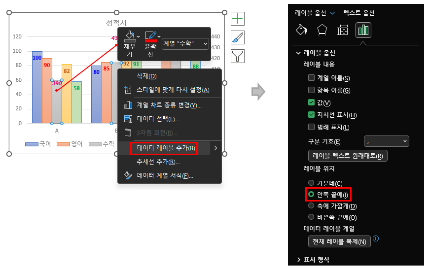참고로 각 계열 그래프의 점수(레이블)는 데이터 레이블 추가 후 레이블 옵션에서 위치를 안쪽 끝에로 지정해준 상태입니다.