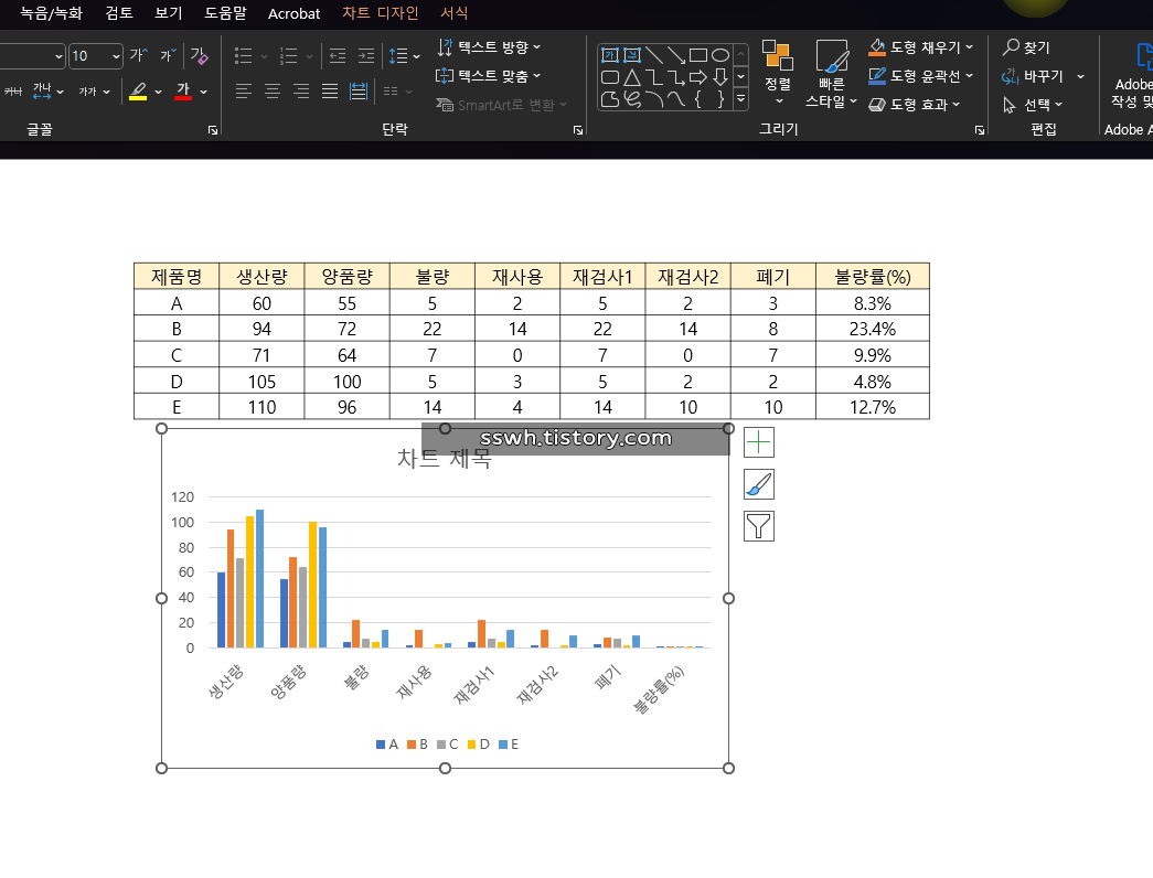 하지만 파워포인트 상의 표 데이터에서 차트를 만들면 전혀 다른 서식의 형태로 만들어집니다.