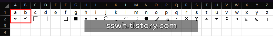자신이 원하는 셀 또는 텍스트를 선택 후 폰트 목록에서 Marlett을 검색 후 적용하면 됩니다.