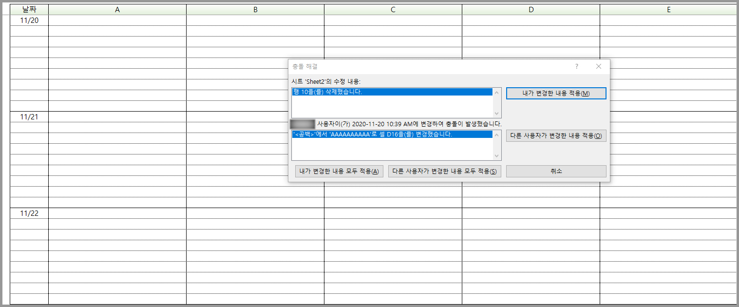 만약 동일한 위치에서 작업이 이루어졌다면 다음과 같이 충돌이 발생하였음을 팝업창으로 알려줍니다.